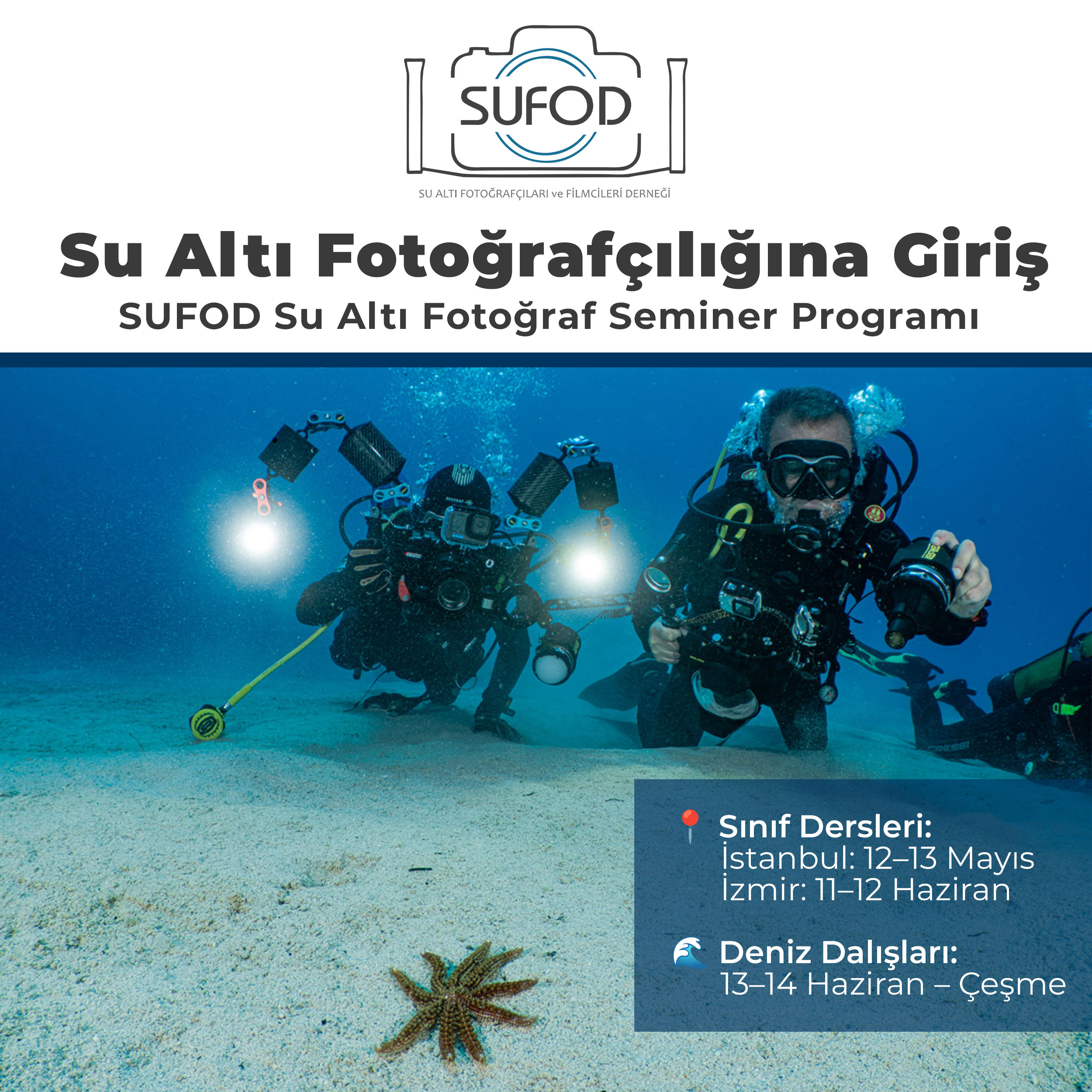 Su Altı Fotoğrafçıları ve Filmcileri Derneği (SUFOD) olarak, üyelerimiz ve üye olmak isteyen adaylar için kapsamlı bir Su Altı Fotoğraf Seminer Programı başlatıyoruz.
